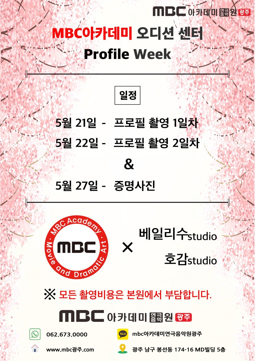 < 프로필 위크 > - 수강생 전원 프로필 촬영 페이지 정보 작성자 관리자 댓글 0건 조회 32,498회 작성일 19-04-15 21:25 본문 < 프로필 위크 > - 수강생 전원 프로필 촬영 목록 이전글 [연기센터] 모델연기반 개강 19.05.21 다음글 2020학년도 예고입시반 모집 19.04.12