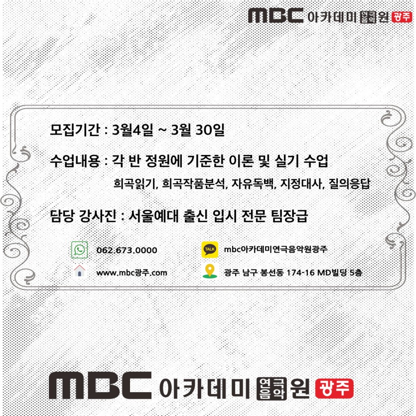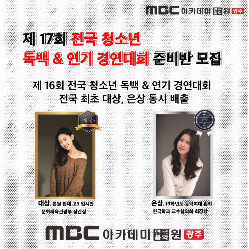 2019년 전국 청소년 독백&연기 경연대회 준비반 모집 페이지 정보 작성자 관리자 댓글 0건 조회 33,169회 작성일 19-03-08 17:28 본문 2019년 전국 청소년 독백&연기 경연대회 준비반 모집 목록 이전글 [연기센터-모델연기전공] 이석빈 학생 한림예고 편입학 합격 19.04.05 다음글 2020학년도 입시반 모집 19.03.03