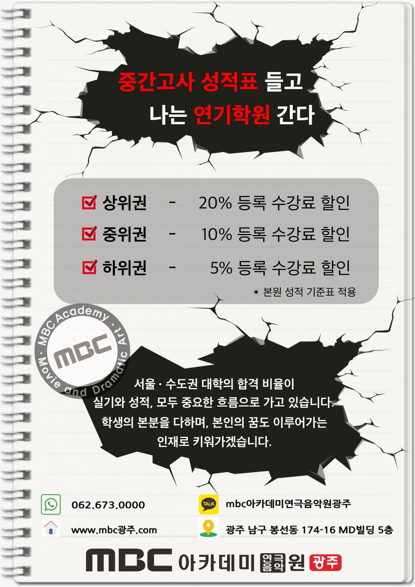 중간고사 이벤트 페이지 정보 작성자 관리자 댓글 0건 조회 32,554회 작성일 19-04-10 20:03 본문 중간고사 성적표 들고 연기학원 간다! 목록 이전글 2020학년도 예고입시반 모집 19.04.12 다음글 모델연기 입시체험캠프 1기 19.04.06