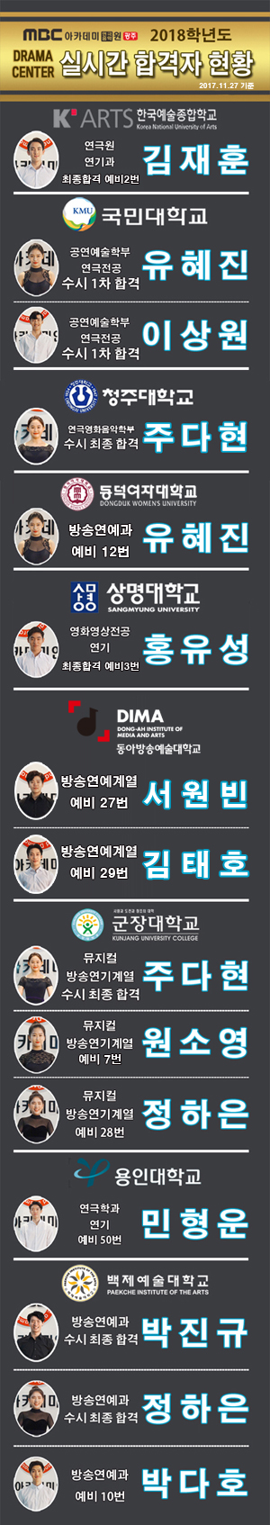 [드라마센터] 2018학년도 수시합격자 현황 페이지 정보 작성자 관리자 댓글 0건 조회 32,183회 작성일 17-11-29 20:03 본문 2018학년도 수시합격자 현황 목록 이전글 [뮤직센터] 2018학년도 수시합격자 현황 17.11.29 다음글 [모델센터] 프로젝트 런웨이 8기 모델캠프 17.11.27