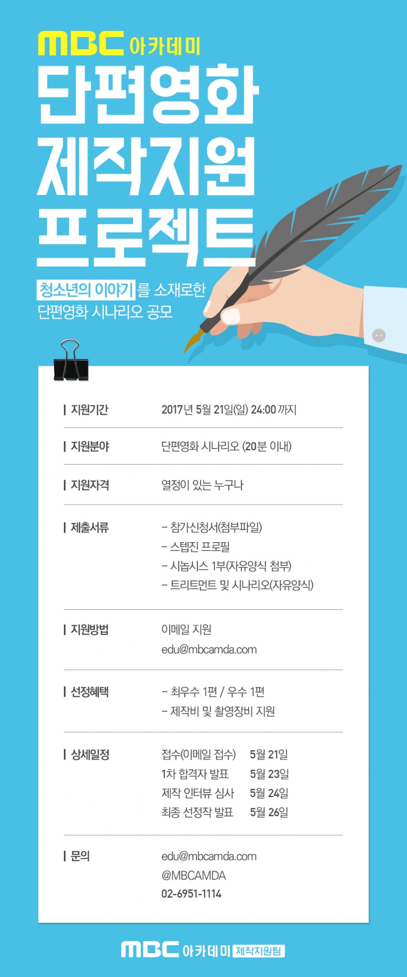 [드라마센터]단편영화제작지원프로젝트 페이지 정보 작성자 관리자 댓글 0건 조회 31,812회 작성일 17-05-08 19:39 본문 첨부파일 단편영화_제작지원_프로젝트_참가신청서.hwp (49.0K) 290회 다운로드 | DATE : 2017-05-08 21:24:34 목록 이전글 2014학년~2017학년 | 드라마센터/뮤직센터/모델연기센터 합격자명단 17.05.11 다음글 [드라마센터]5월지정도서-청소년독백대회 도서 17.05.06