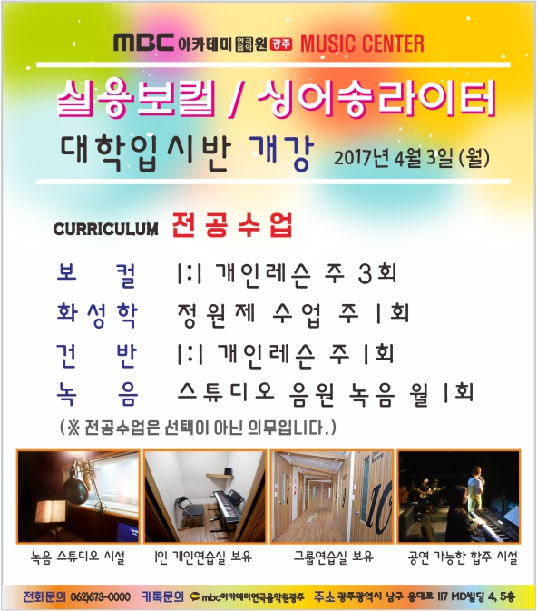 [뮤직센터] 실용보컬/싱어송라이터 대학입시반 개강 페이지 정보 작성자 관리자 댓글 0건 조회 30,329회 작성일 17-03-13 21:08 본문 실용보컬/싱어송라이터 대학입시반 개강 목록 이전글 [뮤직센터] 뮤지컬과 - 입시대비반 17.03.16 다음글 [뮤직센터] 뮤지컬과 대학입시반 개강 17.03.13