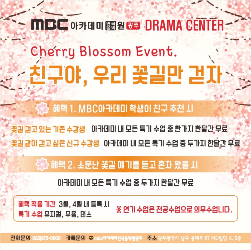 [드라마센터]벚꽃이벤트-친구야!우리 꽃길만 걷자 페이지 정보 작성자 관리자 댓글 0건 조회 29,850회 작성일 17-03-03 22:30 본문 새학기 이벤트 벚꽃이벤트-친구야!우리 꽃길만 걷자 목록 이전글 [뮤직센터]벚꽃이벤트-친구야! 우리 꽃길만 걷자 17.03.03 다음글 대학입시반&재입시반 에쮸드 발표회 17.02.28