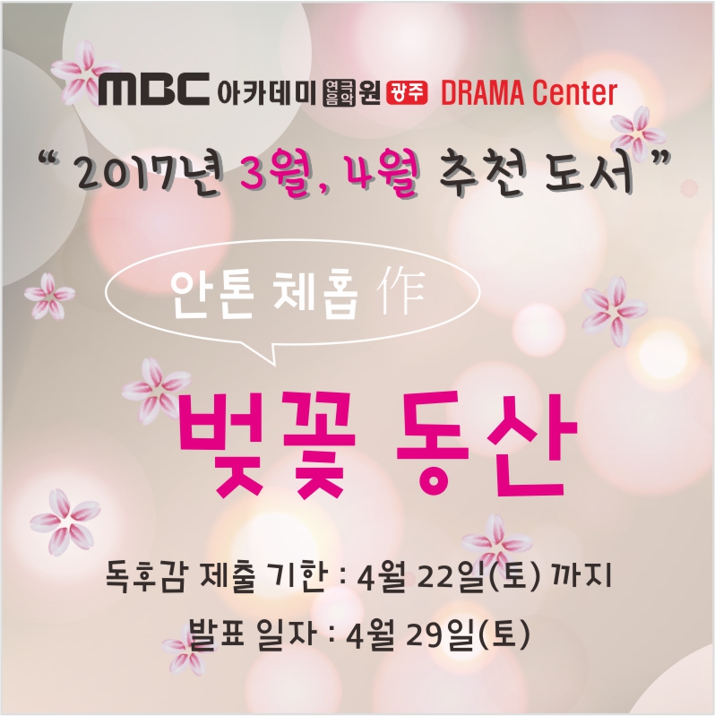 3월,4월 추천도서 " 벚꽃동산 " 페이지 정보 작성자 관리자 댓글 0건 조회 29,750회 작성일 17-03-08 19:17 본문 안톤체홉 "벚꽃동산" 목록 이전글 [드라마센터]성인데뷔반 모집! 17.03.10 다음글 [뮤직센터]벚꽃이벤트-친구야! 우리 꽃길만 걷자 17.03.03