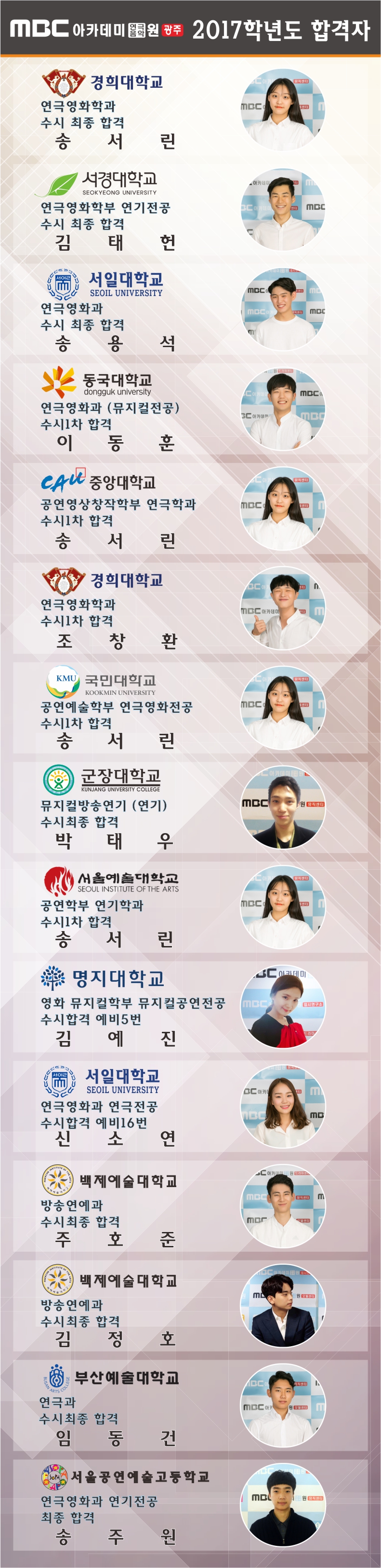 2017학년도 합격자 페이지 정보 작성자 관리자 댓글 0건 조회 29,328회 작성일 16-10-17 18:12 본문 2017학년도 합격자 목록 이전글 [드라마센터] 제4회정기공연 "안네의일기" 광주문화관광책자 "문화마실"에 실리다. 16.10.26 다음글 [뮤직센터] 2016년 10월 무료체험캠프 16.10.06