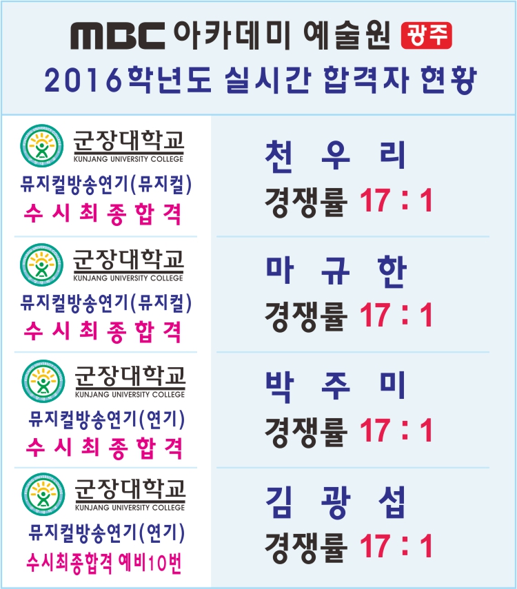2016학년도 실시간 합격자 현황 [군장대] 페이지 정보 작성자 관리자 댓글 0건 조회 26,977회 작성일 15-10-14 15:38 본문 2016학년도 실시간 합격자 현황 목록 이전글 2016학년도 실시간 합격자 현황 [상명대] 15.10.19 다음글 합격자 현황 15.10.14
