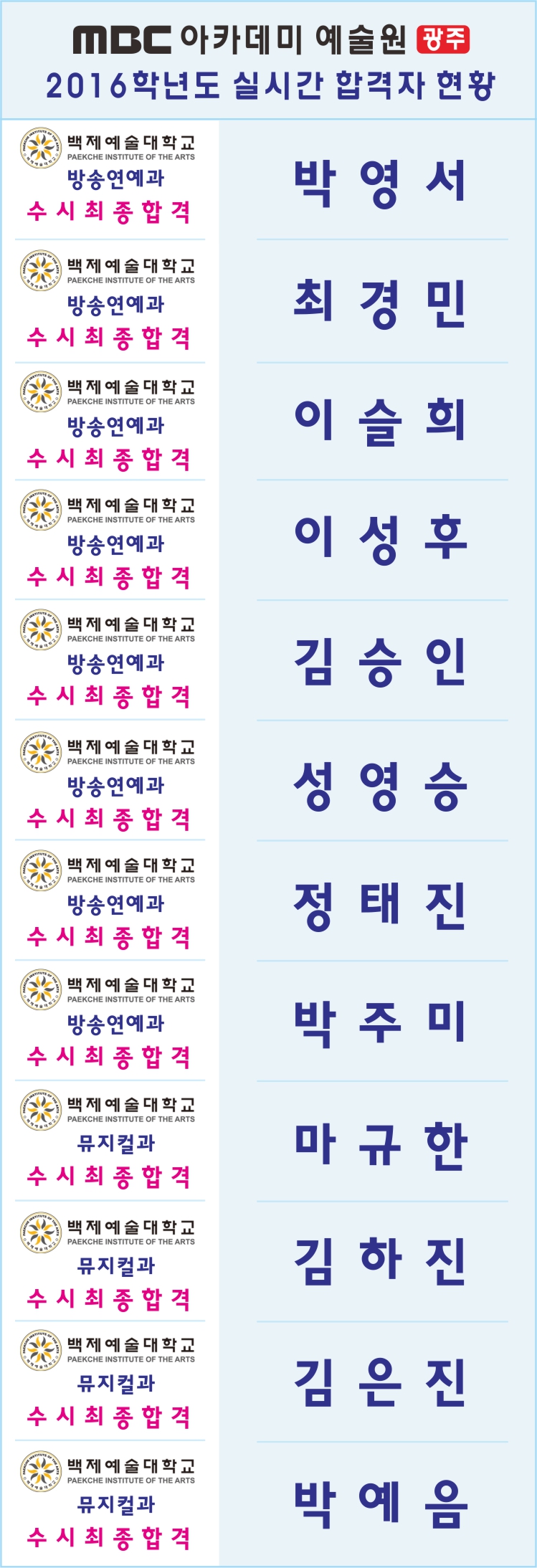 2016학년도 실시간 합격자 현황 [백제예대] 페이지 정보 작성자 관리자 댓글 0건 조회 27,673회 작성일 15-10-21 21:07 본문 2016학년도 실시간 합격자 현황 목록 이전글 2016학년도 실시간 합격자 현황 [호원대] 15.10.22 다음글 2016학년도 실시간 합격자 현황 [서울예대] 15.10.20