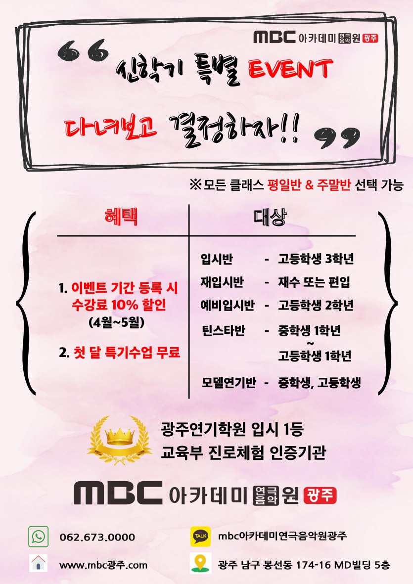 신학기 특별 EVENT - 다녀보고 결정하자 페이지 정보 작성자 관리자 댓글 0건 조회 26,268회 작성일 19-04-02 22:34 본문 신학기 특별 EVENT - 다녀보고 결정하자 목록 이전글 모델연기 입시체험캠프 1기 19.04.06 다음글 <배우특강> 진선규 배우 19.02.08