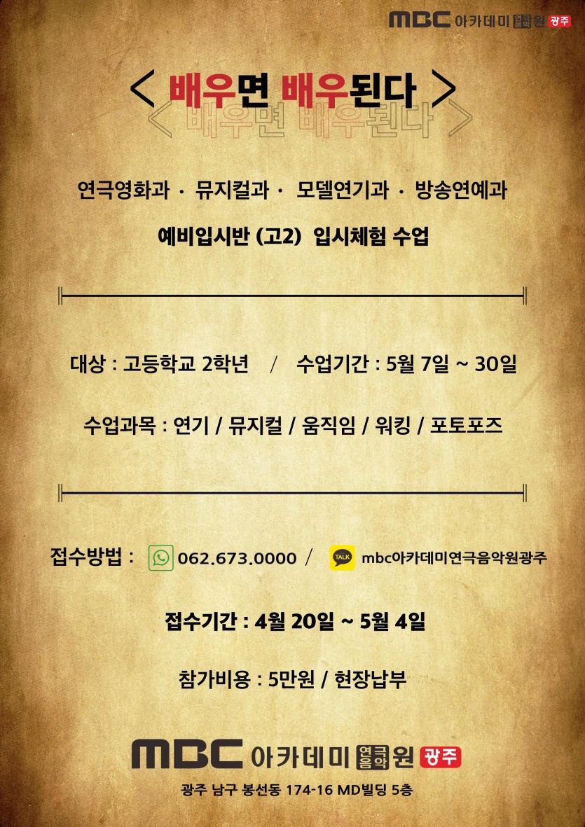 예비입시반 입시체험 수업 페이지 정보 작성자 관리자 댓글 0건 조회 25,888회 작성일 19-04-23 22:39 본문 예비입시반 입시체험 수업 목록 이전글 롱 리브 더 킹 - MBC아카데미연극음악원 제작지원 시사회 19.06.20 다음글 모델연기 입시체험캠프 1기 19.04.06