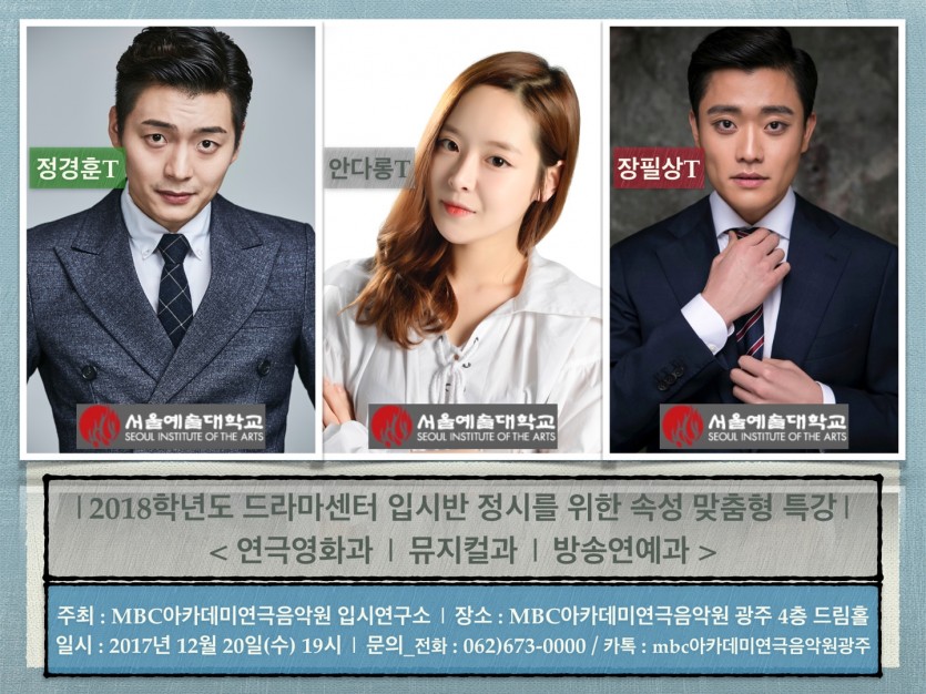 2018학년도 정시를 위한 드라마센터 속성 맞춤형 특강 페이지 정보 작성자 관리자 댓글 0건 조회 24,802회 작성일 17-12-16 19:08 본문 2018학년도 정시를 위한 드라마센터 속성 맞춤형 특강 목록 이전글 [드라마센터] 20주년 기념 장학생 선발 오디션 - 연기 / 뮤지컬 18.01.05 다음글 FNC엔터테인먼트 오디션 17.12.14