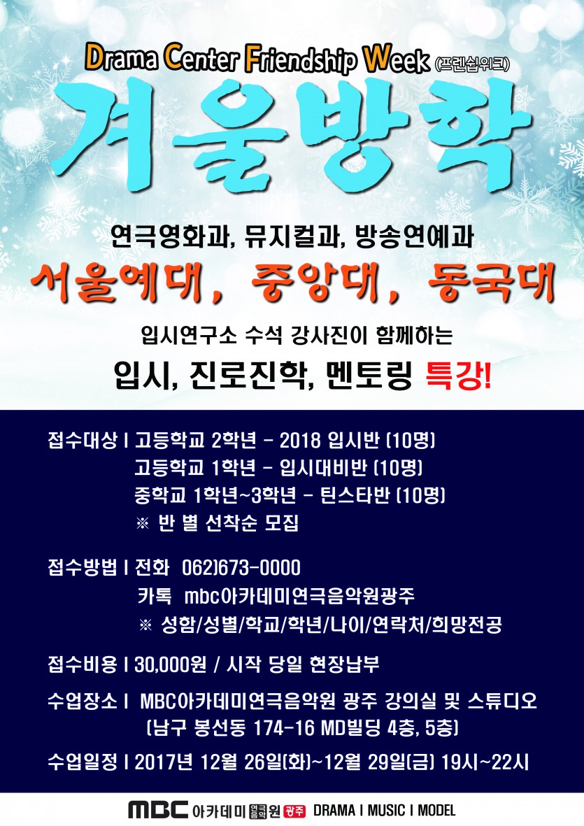 [드라마센터] 프렌쉽위크 - 체험수업 페이지 정보 작성자 관리자 댓글 0건 조회 25,321회 작성일 17-12-02 19:20 본문 프렌쉽위크 - 체험수업 목록 이전글 바나나컬쳐 오디션 17.12.04 다음글 영화 ‘심증’ 조, 단역 및 이미지 단역 오디션 17.11.07