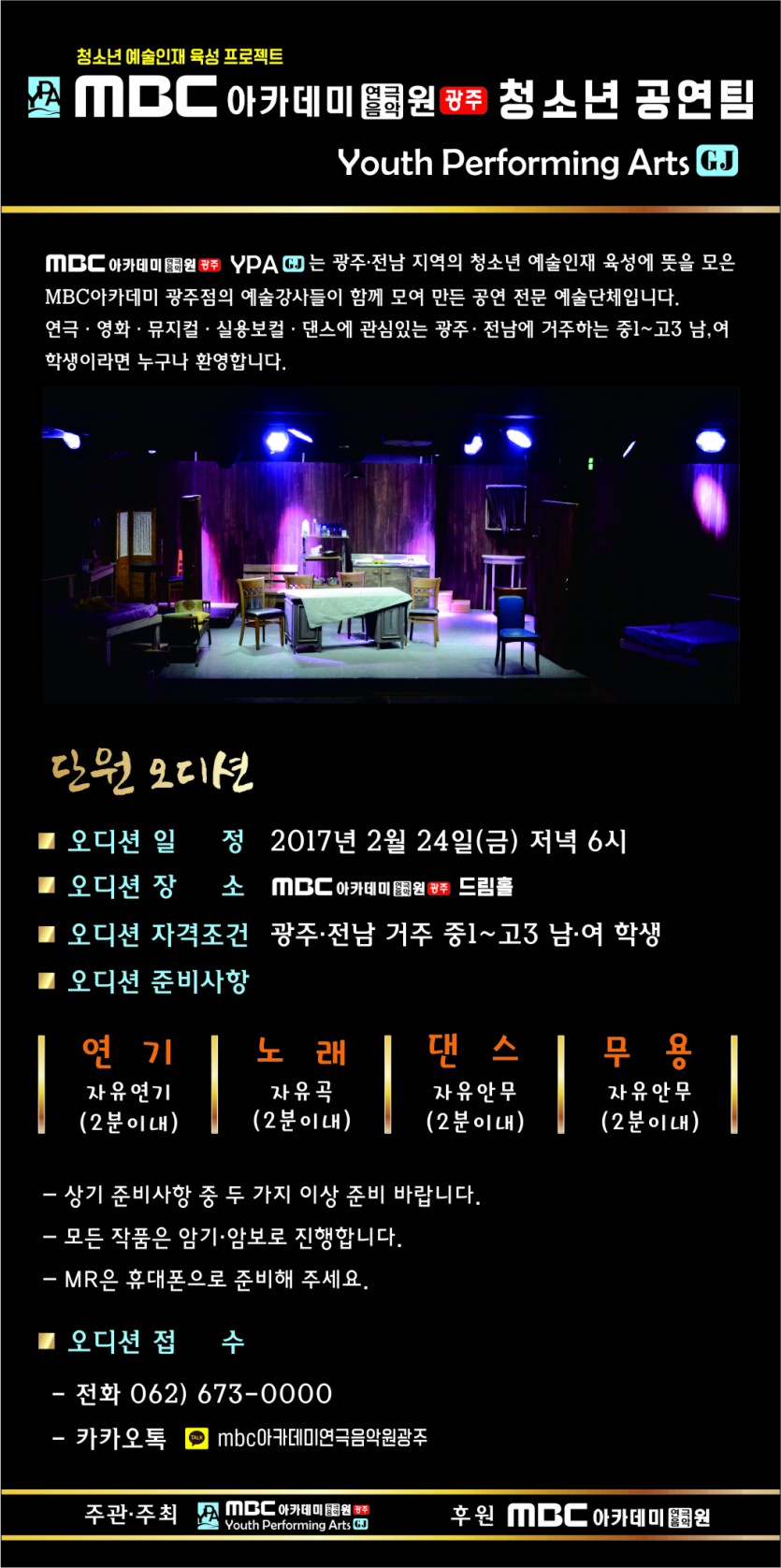 MBC아카데미연극음악원[광주] 청소년공연팀 오디션 [Youth Performing Arts GJ] 페이지 정보 작성자 관리자 댓글 0건 조회 23,453회 작성일 17-02-01 15:50 본문 MBC아카데미연극음악원 청소년공연팀 오디션 목록 이전글 FNC 엔터테인먼트 내방오디션 17.02.07 다음글 [뮤직센터] 수험생 이벤트 16.11.24