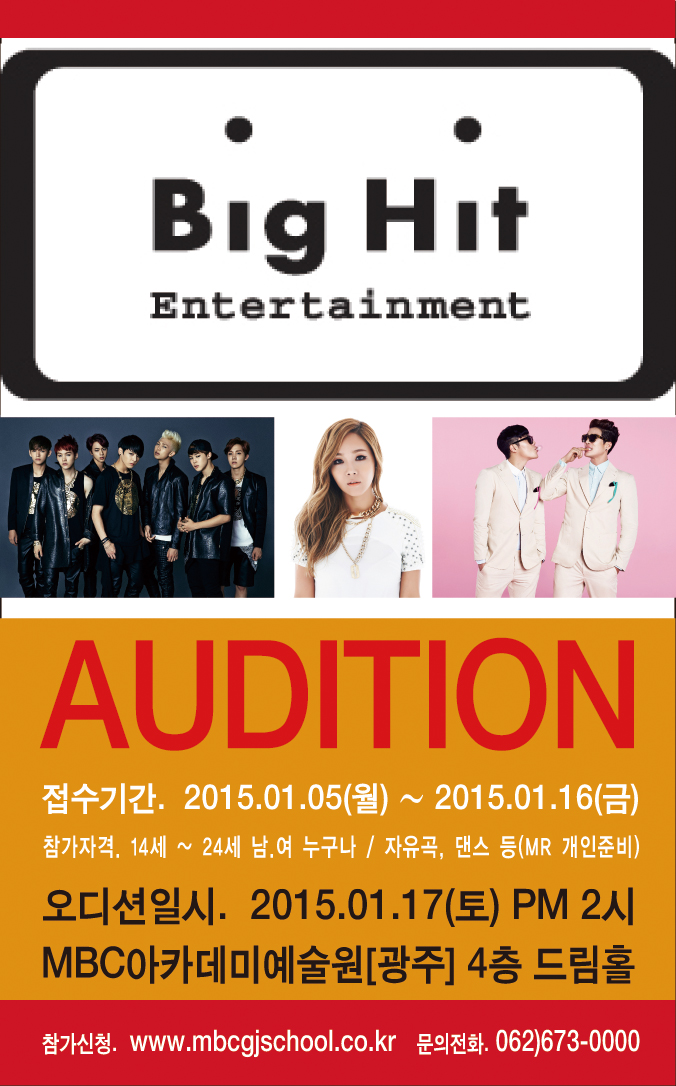 빅히트엔터테인먼트 오디션 페이지 정보 작성자 관리자 댓글 0건 조회 22,967회 작성일 15-01-22 18:30 본문 방탄소년단, 옴므, 임정희 등 소속되어 있는 빅히트엔터테인먼트 오디션 목록 이전글 N company entertainment AUDITION!!! 15.02.10 다음글 키이스트 오디션 14.11.12
